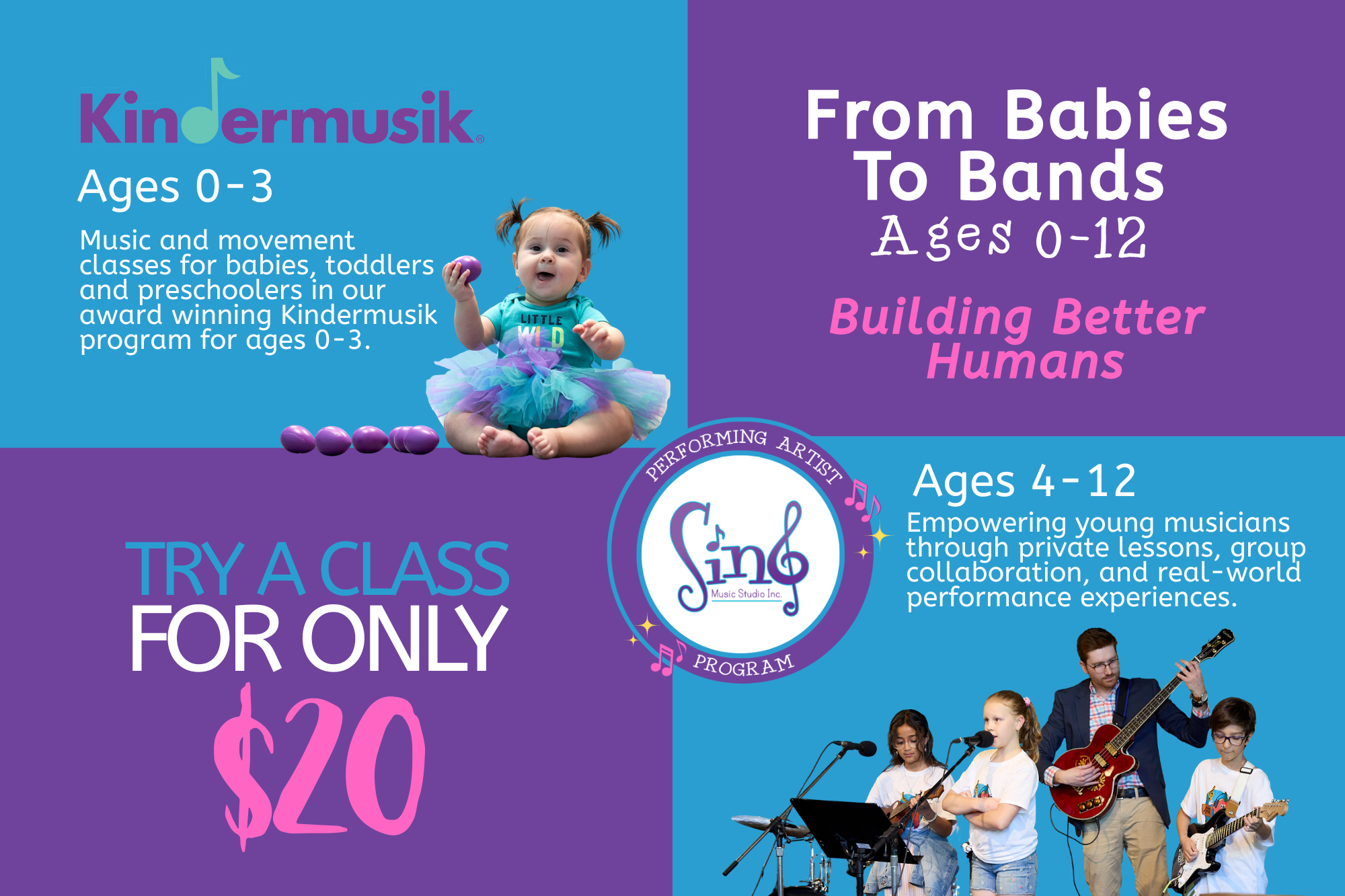 Trial classes are the perfect way to come and experience what we are all about here at Sing Music Studio. Start your musical journey today with zero pressure and 100% fun for only $20. We can’t wait to meet you!